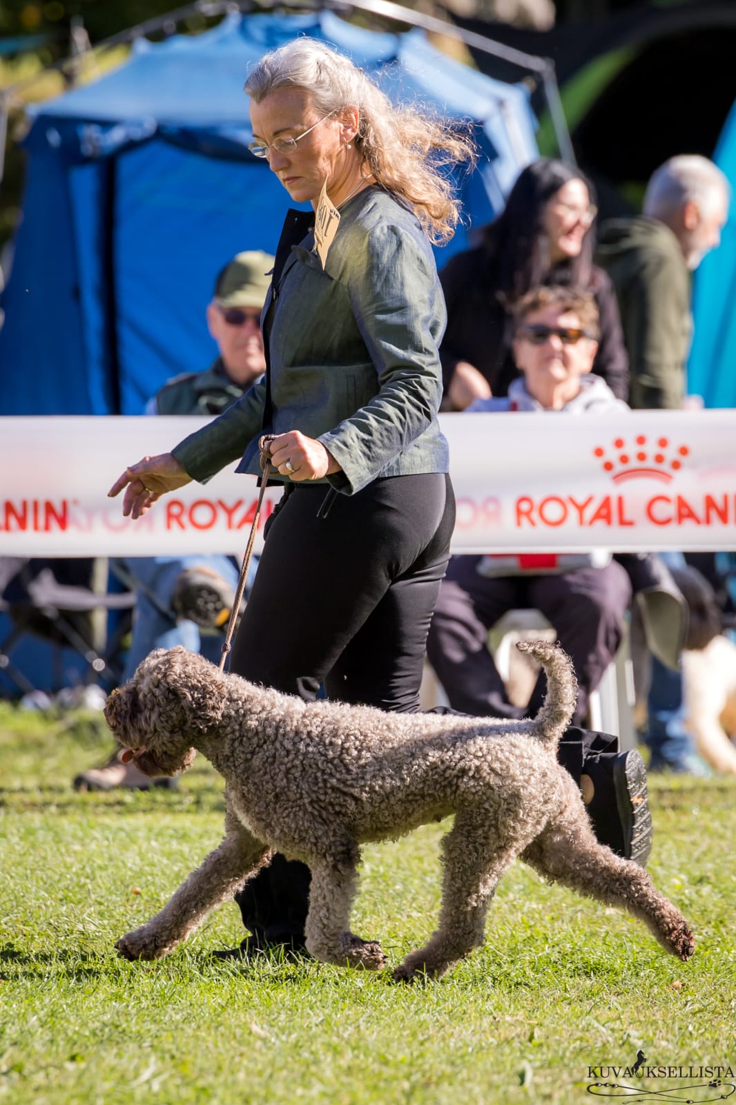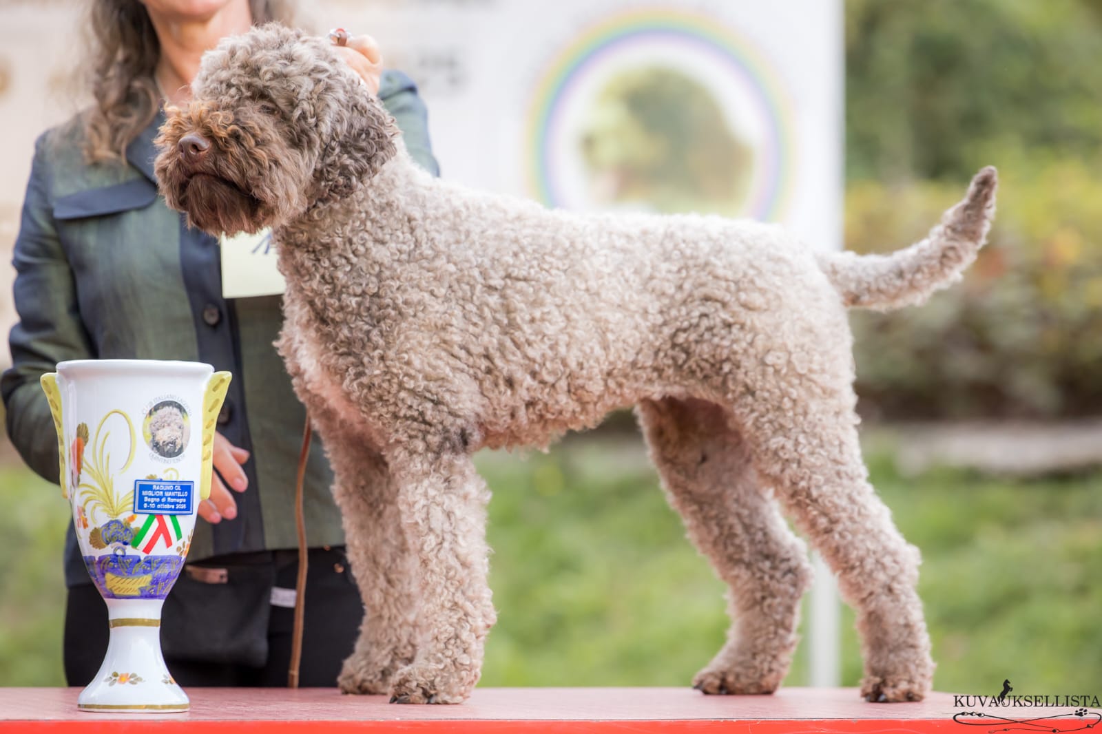 Wanja dieses Jahr in Bagno die Romagna, 10.10.2025, auf der größten Lagotto Romangolo Ausstellung des italienischen Lagotttoclubs und wahrscheinlich auch der Meldezahlen nach der größten Lagotto Ausstellung weltweit. Sie erhielt von der Richterin Katrien van Gemert (NL) in der Gebrauchshundklasse ein Vorzüglich 3 und am Abend gewann sie den Kontest "Schönstes Fell" von allen übr 220 Lagotti, die auf der Ausstellung gemeldet waren.